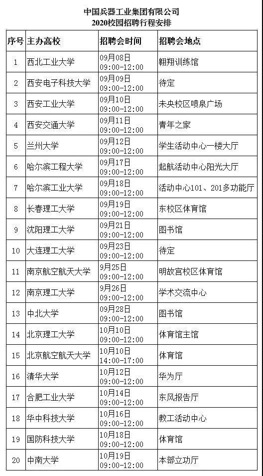 中國(guó)兵器工業(yè)集團(tuán)2020屆校園招聘會(huì)將在全國(guó)12個(gè)城市、20所高校舉辦,招聘會(huì)具體行程見(jiàn)下表: