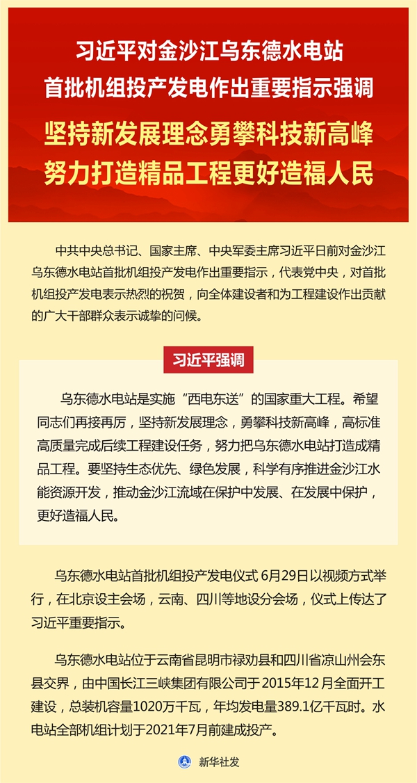 新華社北京6月29日電 中共中央總書記、國家主席、中央軍委主席習(xí)近平日前對(duì)金沙江烏東德水電站首批機(jī)組投產(chǎn)發(fā)電作出重要指示,代表黨中央,對(duì)首批機(jī)組投產(chǎn)發(fā)電表示熱烈的祝賀,向全體建設(shè)者和為工程建設(shè)作出貢獻(xiàn)的廣大干部群眾表示誠摯的問候。 習(xí)近平強(qiáng)調(diào),烏東德水電站是實(shí)施“西電東送”的國家重大工程。希望同志們?cè)俳釉賲枺瑘?jiān)持新發(fā)展理念,勇攀科技新高峰,高標(biāo)準(zhǔn)高質(zhì)量完成后續(xù)工程建設(shè)任務(wù),努力把烏東德水電站打造成精品工程。要堅(jiān)持生態(tài)優(yōu)先、綠色發(fā)展,科學(xué)有序推進(jìn)金沙江水能資源開發(fā),推動(dòng)金沙江流域在保護(hù)中發(fā)展、在發(fā)展中保護(hù),更好造福人民。 烏東德水電站首批機(jī)組投產(chǎn)發(fā)電儀式29日以視頻方式舉行,在北京設(shè)主會(huì)場(chǎng),云南、四川等地設(shè)分會(huì)場(chǎng),儀式上傳達(dá)了習(xí)近平重要指示。 烏東德水電站位于云南省昆明市祿勸縣和四川省涼山州會(huì)東縣交界,由中國長(zhǎng)江三峽集團(tuán)有限公司于2015年12月全面開工建設(shè),總裝機(jī)容量1020萬千瓦,年均發(fā)電量389.1億千瓦時(shí)。水電站全部機(jī)組計(jì)劃于2021年7月前建成投產(chǎn)。