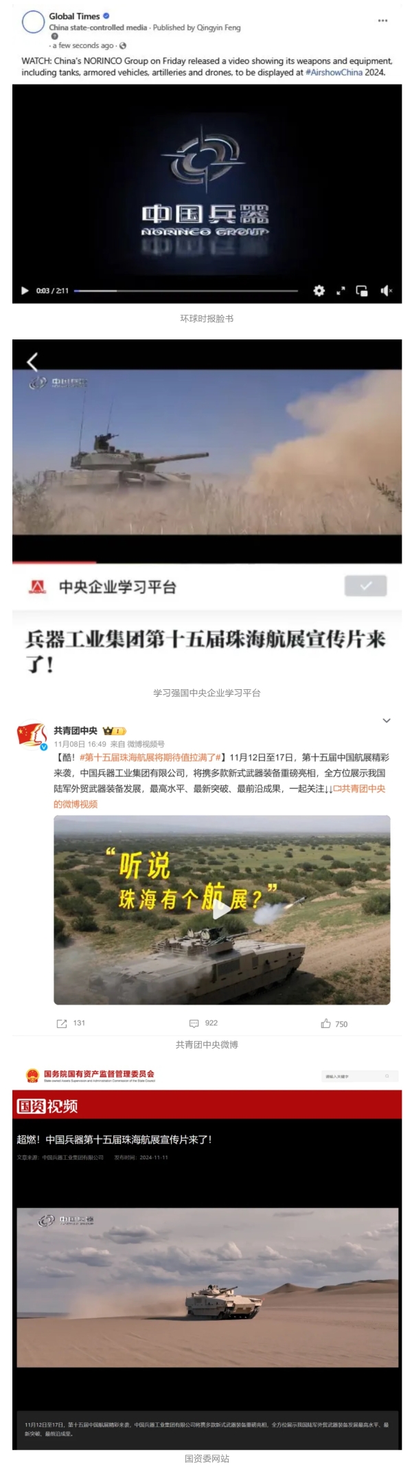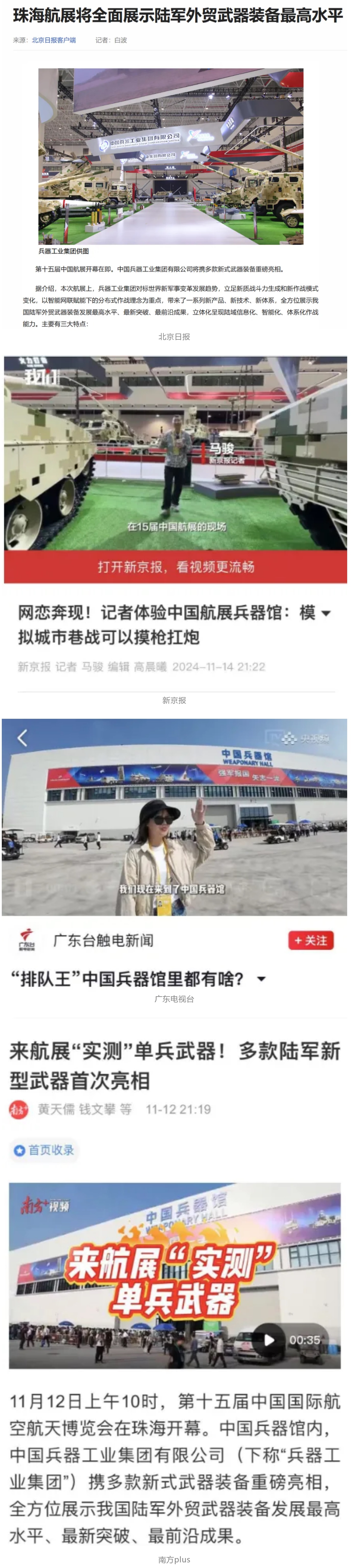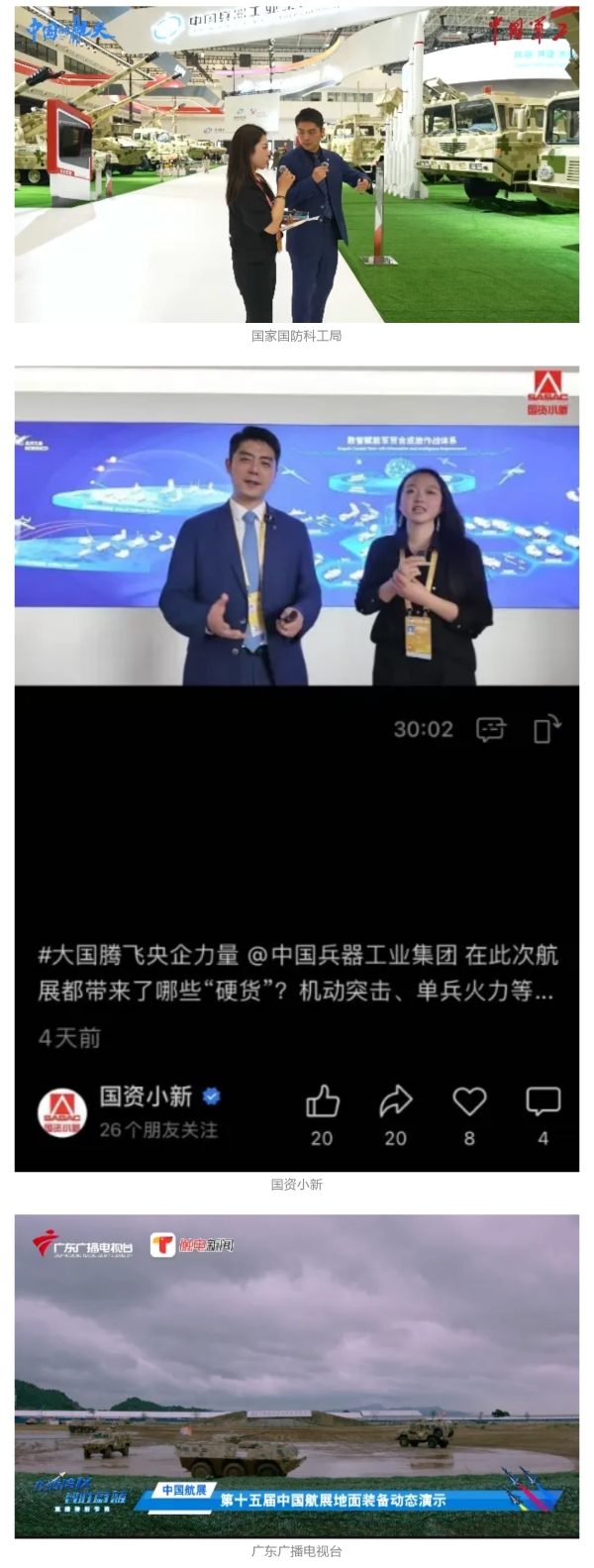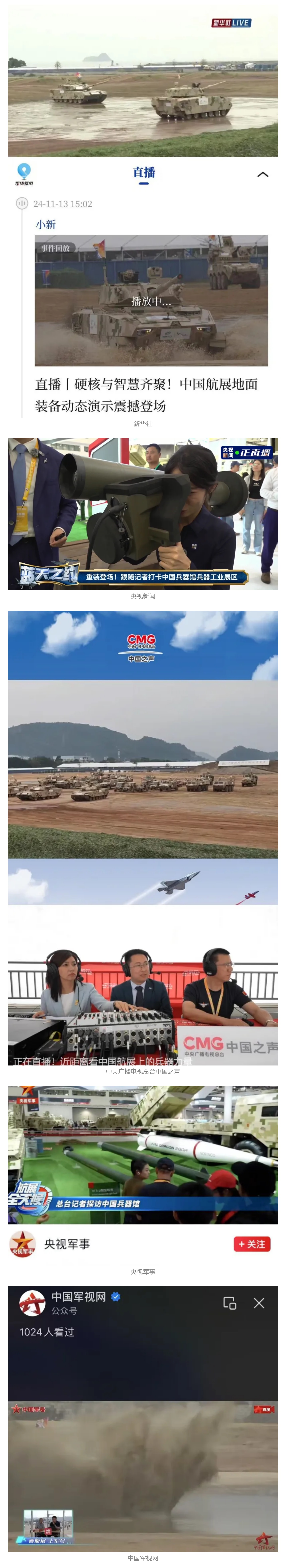 新華社、央視新聞、中央廣播電視總臺中國之聲、央視軍事、中國軍視網、廣東廣播電視臺等媒體以及國家國防科工局、國資小新等到兵器工業(yè)集團地面動態(tài)演示區(qū)、中國兵器館進行了直播。