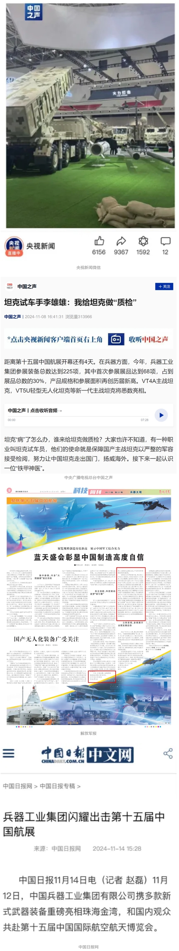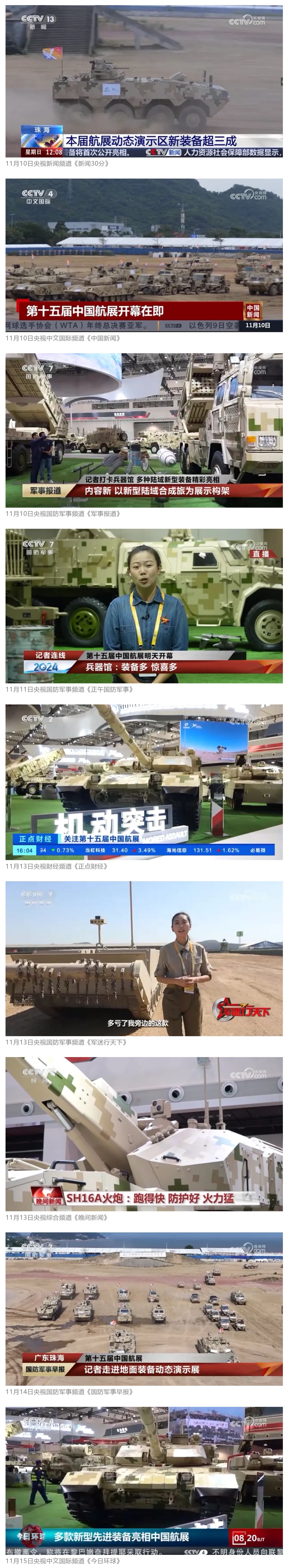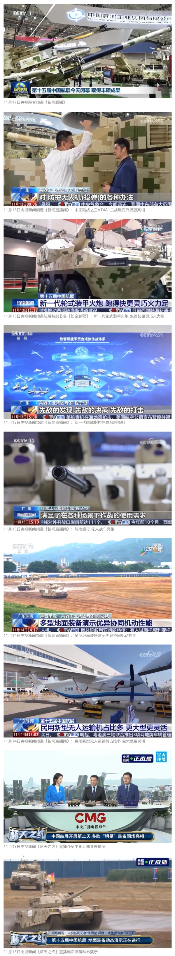11月13日央視新聞《藍天之約》直播地面裝備動態(tài)演示此次航展,央視綜合頻道《新聞聯(lián)播》《晚間新聞》、新聞頻道《新聞直播間》《新聞30分》《朝聞天下》《共同關注》《東方時空》《午夜新聞》、財經頻道《天下財經》《經濟信息聯(lián)播》《正點財經》《第一時間》、中文國際頻道《今日環(huán)球》《中國新聞》、國防軍事頻道《軍事報道》《正午國防軍事》《國防軍事早報》《軍迷行天下》等欄目共播出兵器工業(yè)集團參展相關新聞報道40余條。11月10日央視新聞頻道《新聞30分》11月10日央視中文國際頻道《中國新聞》11月10日央視國防軍事頻道《軍事報道》11月11日央視國防軍事頻道《正午國防軍事》