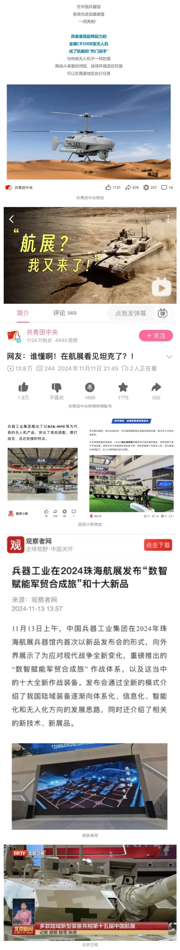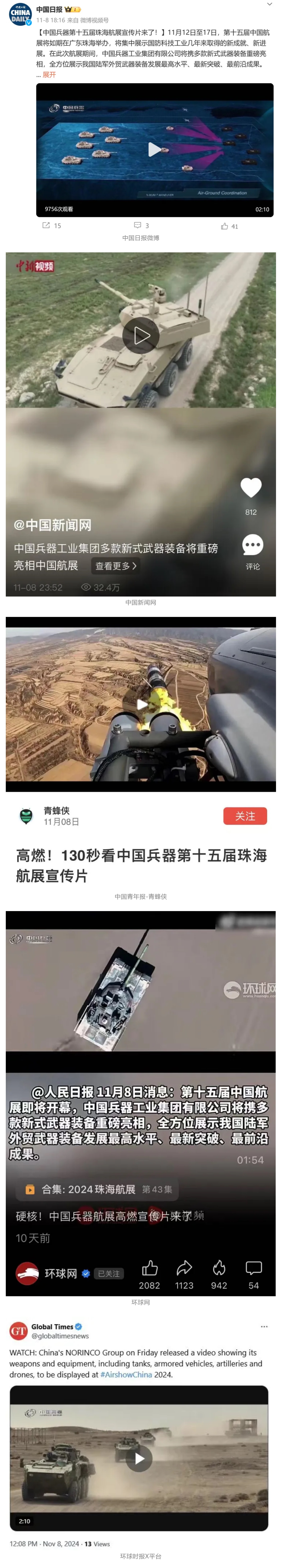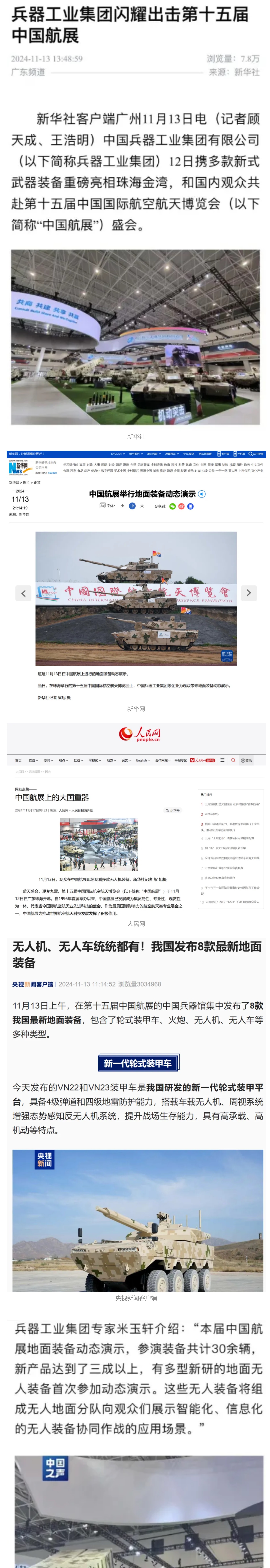 11月13日央視新聞《藍天之約》直播地面裝備動態(tài)演示此次航展,央視綜合頻道《新聞聯(lián)播》《晚間新聞》、新聞頻道《新聞直播間》《新聞30分》《朝聞天下》《共同關注》《東方時空》《午夜新聞》、財經頻道《天下財經》《經濟信息聯(lián)播》《正點財經》《第一時間》、中文國際頻道《今日環(huán)球》《中國新聞》、國防軍事頻道《軍事報道》《正午國防軍事》《國防軍事早報》《軍迷行天下》等欄目共播出兵器工業(yè)集團參展相關新聞報道40余條。11月10日央視新聞頻道《新聞30分》11月10日央視中文國際頻道《中國新聞》11月10日央視國防軍事頻道《軍事報道》11月11日央視國防軍事頻道《正午國防軍事》