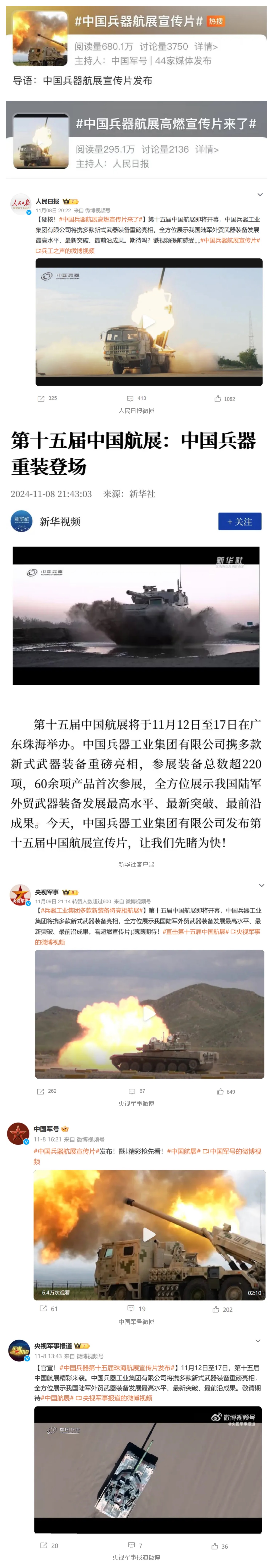人民日報微博、新華社客戶端、央視軍事微博、中國軍號微博、央視軍事報道微博、中國日報微博、中國新聞網、中國青年報-青蜂俠、環(huán)球網、環(huán)球時報(臉書、X平臺)、學習強國中央企業(yè)學習平臺、共青團中央微博、國資委網站等20余家中央主流媒體、國家部委的新媒體第一時間播發(fā)集團公司航展宣傳片等視頻作品燃爆全網,累計閱讀量突破1200萬人次。集團公司微信公眾號、微博、抖音號、快手號、微信視頻號、知乎號等新媒體宣傳片播放閱讀量近1000萬人次,點贊近20萬人次。