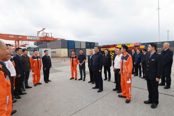 隨后,習(xí)近平來到重慶鐵路集裝箱中心站,聽取貨物集散、運輸路徑、運營成本和效益等介紹,同貨車司機、列車司機、裝卸工人、場站管理人員等親切交流,詢問他們的工作強度、勞動保護、節(jié)假日休息和收入情況。習(xí)近平說,大家在物流一線,也是在對外開放一線,通過你們的辛勤勞動,很多商品跨越山海、走向世界,你們的工作很有意義。推動西部大開放、促進西部大開發(fā),物流很重要,大家要繼續(xù)努力,不斷創(chuàng)造新的業(yè)績,作出新的貢獻。