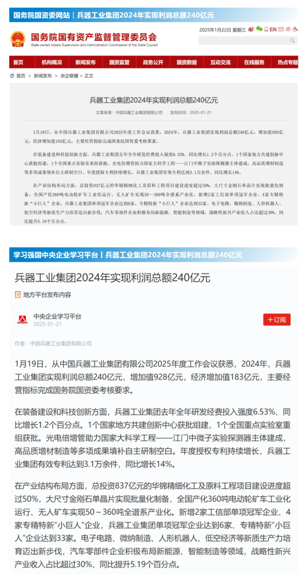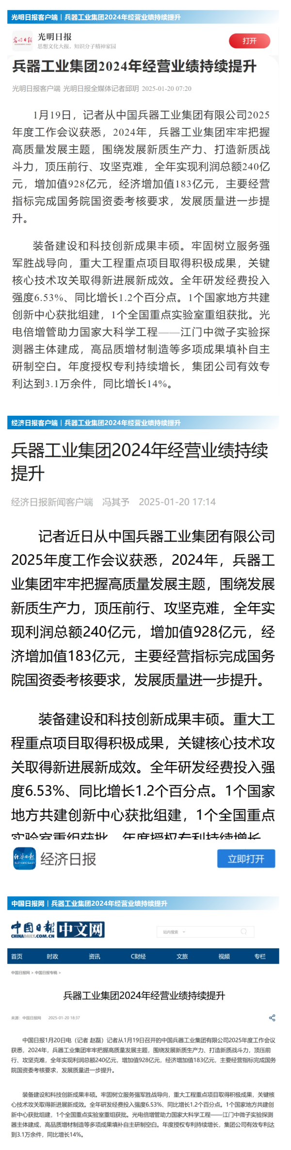 1月19日至20日,中國兵器工業(yè)集團(tuán)有限公司2025年度工作會議在京召開,會議總結(jié)2024年工作,分析形勢任務(wù),明確工作思路,部署2025年工作。 集團(tuán)公司2024年取得的成績及下一步重點(diǎn)工作受到社會媒體廣泛關(guān)注。新華社、中國新聞網(wǎng)、中國科技網(wǎng)、光明日報(bào)客戶端、經(jīng)濟(jì)日報(bào)客戶端、中國日報(bào)網(wǎng)、國務(wù)院國資委網(wǎng)站、學(xué)習(xí)強(qiáng)國中央企業(yè)學(xué)習(xí)平臺、新浪網(wǎng)、網(wǎng)易網(wǎng)、搜狐網(wǎng)、騰訊網(wǎng)、鳳凰網(wǎng)等中央主流媒體、國家部委網(wǎng)站及知名網(wǎng)絡(luò)媒體對集團(tuán)公司2025年度工作會議進(jìn)行了報(bào)道,重點(diǎn)關(guān)注集團(tuán)公司經(jīng)營業(yè)績、科技創(chuàng)新、產(chǎn)業(yè)結(jié)構(gòu)布局優(yōu)化等情況。其中,新華社以《我國實(shí)現(xiàn)50至360噸無人礦車全譜系產(chǎn)業(yè)化》為題,重點(diǎn)報(bào)道了集團(tuán)公司在推動智能制造水平提升方面取得的成效;中國新聞網(wǎng)、光明日報(bào)客戶端、經(jīng)濟(jì)日報(bào)客戶端、中國日報(bào)網(wǎng)等就集團(tuán)公司2024年度經(jīng)營業(yè)績及各項(xiàng)工作取得的成果進(jìn)行報(bào)道;中國科技網(wǎng)著重報(bào)道了集團(tuán)公司在科技創(chuàng)新和優(yōu)化產(chǎn)業(yè)結(jié)構(gòu)布局方面的最新進(jìn)展。集團(tuán)公司門戶網(wǎng)站、微信公眾號、微博等新媒體平臺以及《中國兵工報(bào)》也對集團(tuán)公司工作會議進(jìn)行了及時(shí)報(bào)道,各成員單位紛紛對相關(guān)內(nèi)容進(jìn)行轉(zhuǎn)載,引發(fā)全系統(tǒng)關(guān)注。 集團(tuán)公司職工及廣大網(wǎng)友熱議工作會 “2025年工作會為我們指明了發(fā)展方向、明確了奮斗目標(biāo),面對全新的機(jī)遇和挑戰(zhàn),作為兵工人深感責(zé)任重大?!?/p> “科技是第一生產(chǎn)力,一定要以科技創(chuàng)新引領(lǐng)新質(zhì)生產(chǎn)力發(fā)展,為高質(zhì)量發(fā)展提供支撐?!?/p> “把各項(xiàng)工作做深、做實(shí)、做細(xì),努力為集團(tuán)公司高質(zhì)量發(fā)展添磚加瓦?!?/p> “2024年中國兵器展示了大國重器,祝新的一年中再創(chuàng)輝煌!” |