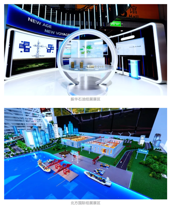 振華石油以“一滴油的故事”串聯(lián)起從勘探開(kāi)采到貿(mào)易服務(wù)的全產(chǎn)業(yè)鏈,揭示油氣勘探的地球密碼。北方礦業(yè)以《千里江山圖》為靈感,將綠色發(fā)展理念融入礦業(yè)開(kāi)發(fā),呈現(xiàn)“綠水青山就是金山銀山”的現(xiàn)代礦業(yè)新圖景。北方國(guó)際通過(guò)創(chuàng)新性的5D穹幕電影、UI互動(dòng)屏幕、2.5D墻上沙盤(pán)等手段,帶領(lǐng)觀眾全景感知電力、礦產(chǎn)、交通等領(lǐng)域一體化建設(shè)的豐碩成果。奧信公司以一體化服務(wù)模型,凸顯全流程自主可控的核心優(yōu)勢(shì)。