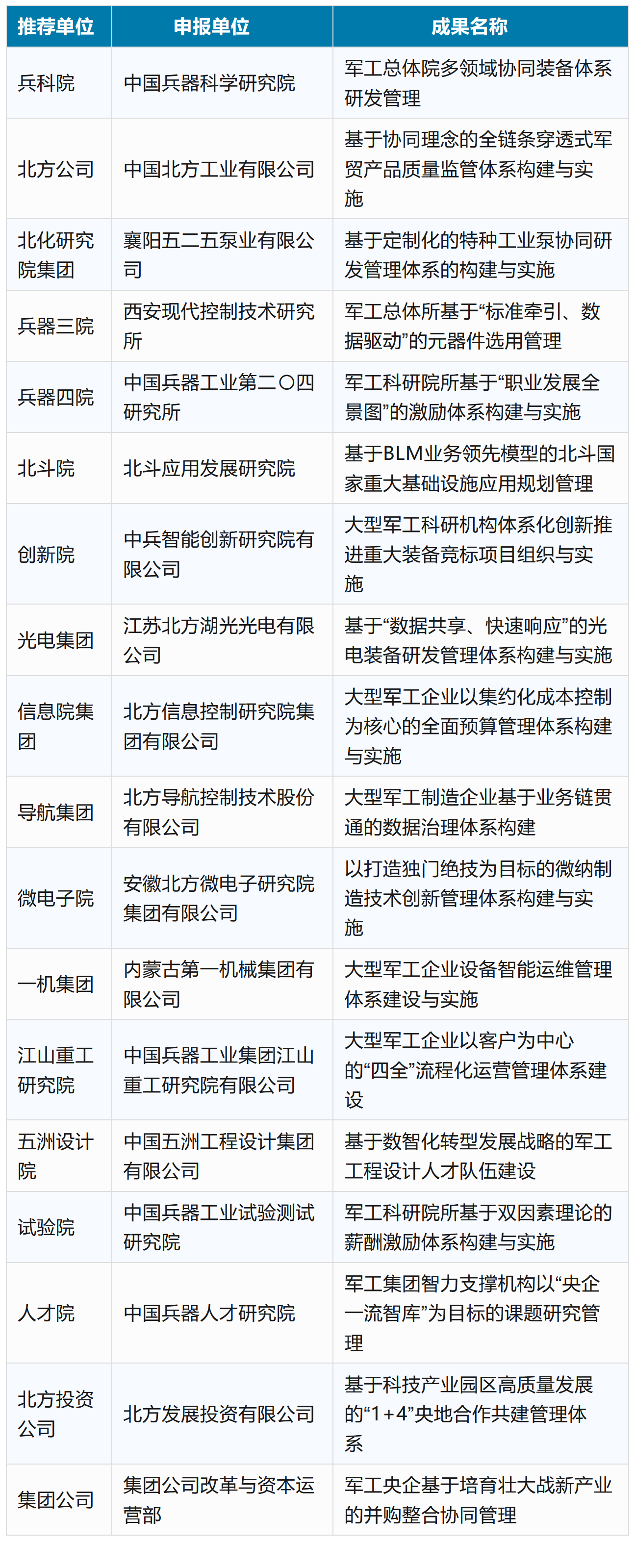 為促進(jìn)管理創(chuàng)新和改革發(fā)展,引導(dǎo)各單位在管理實踐中運用現(xiàn)代管理科學(xué)理論和方法,創(chuàng)新經(jīng)營理念,革新管理制度,改進(jìn)管理方式、管理組織、管理方法,營造鼓勵創(chuàng)新、尊重知識、尊重實踐、尊重人才的創(chuàng)新環(huán)境。中國兵器工業(yè)集團(tuán)有限公司組織開展了2025年度管理創(chuàng)新成果的申報、推薦與審定工作。經(jīng)初審、初評、答辯及終審、公示等環(huán)節(jié),最終評出獲獎成果91項,其中:一等獎18項、二等獎24項、三等獎49項。 兵器工業(yè)集團(tuán)2025年度一等獲獎成果名單