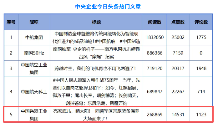 《亮家底兒,曬太陽(yáng)!西藏軍區(qū)某裝備保養(yǎng)大場(chǎng)面來(lái)了!》入選中央企業(yè)今日頭條熱門文章。